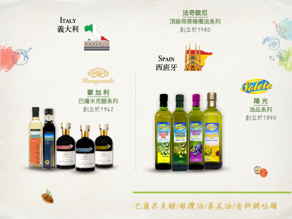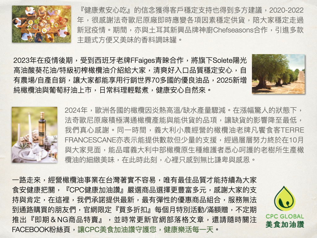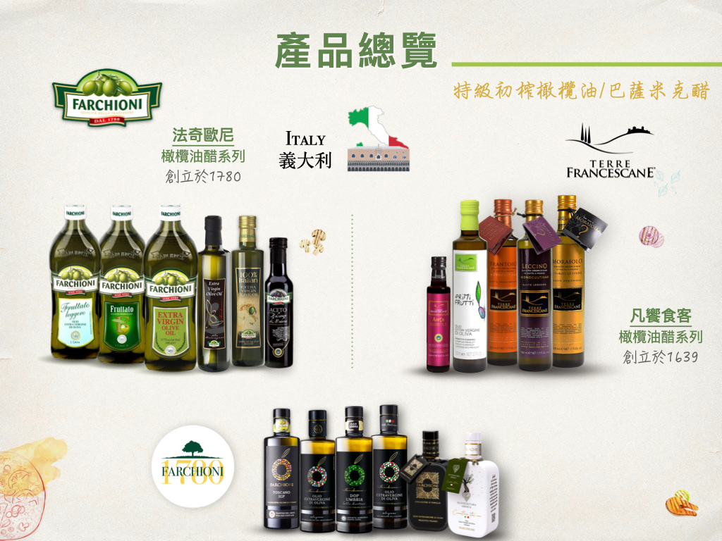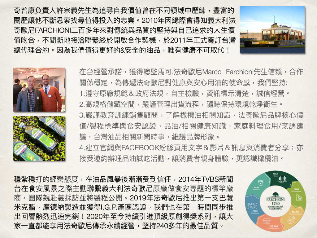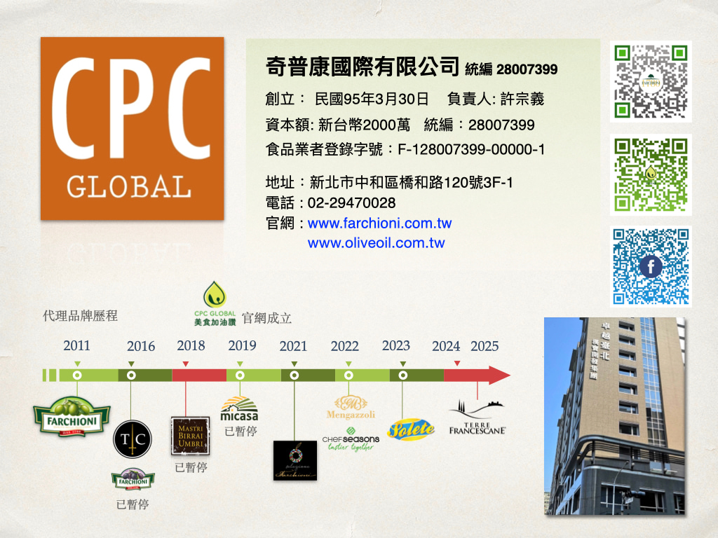 由奇普康國際CPCglobal營運,我們是義大利法奇歐尼橄欖油台灣總代理,亦代理義大利凡饗食客橄欖油/蒙加利巴薩米克醋/西班牙陽光橄欖油&葡萄籽油&高油酸葵花油/土耳其神廚香料調味罐。
