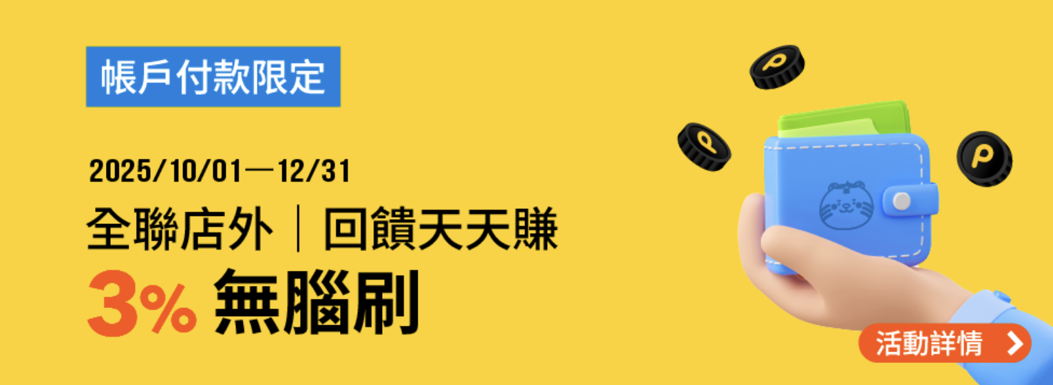 2025/10/1~12/31 使用全支付合作的『銀行帳戶付款』 享3%[全點]回饋限時限量,指定銀行帳戶再加碼3%[全點]限時限量