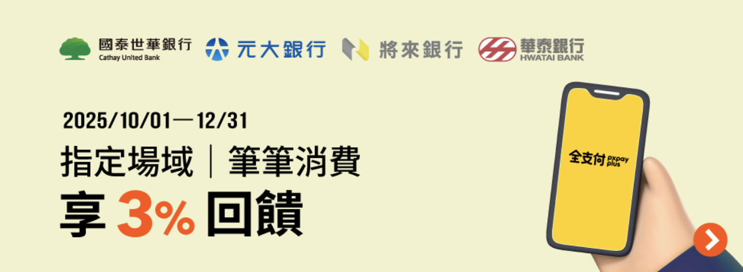 2025/10/1-12/31 指定銀行帳戶-國泰世華銀行/元大銀行/將來銀行/華泰銀行,再加碼3%[全點],每一全支付帳戶每月最高100點,每月/總量回饋均有限額,請點選上圖連結進入每個銀行活動頁面查看