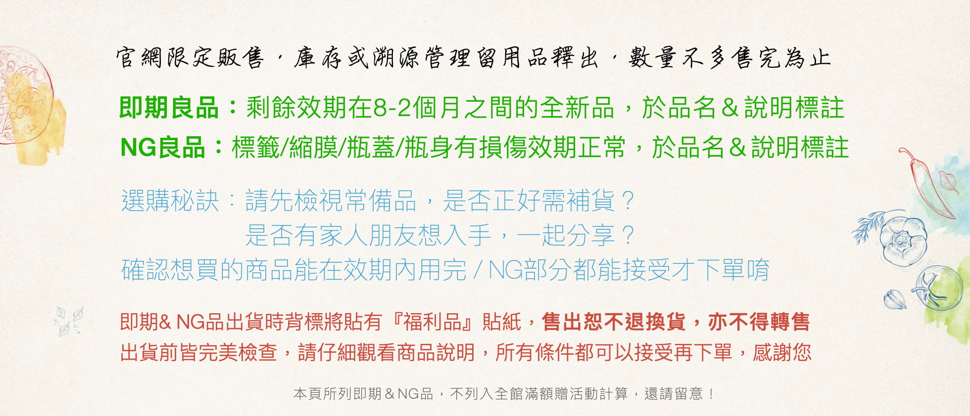 特別提醒:即期良品特賣為均一特價,無法參加正價商品全站滿件69折活動,滿額贈內容亦不相同無法併用,還請留意!